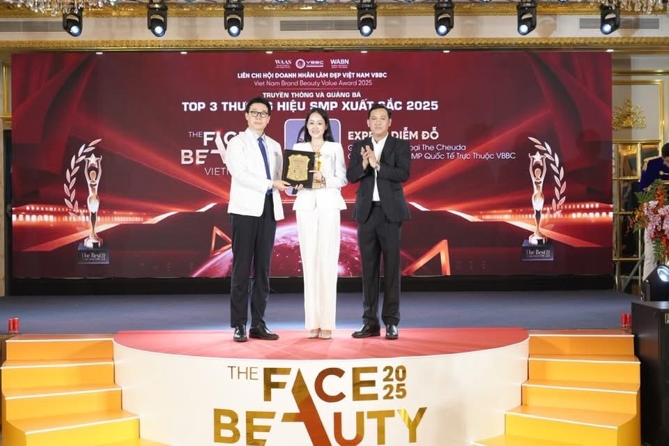 Trên sân khấu The Face Beauty, Master Diễm Đỗ, Giám đốc Đối ngoại The Cheuda, đồng thời là Chủ tịch Liên Chi Hội Doanh nhân Làm đẹp VBBC, đại diện nhận cúp vinh danh trong tiếng vỗ tay chúc mừng của giới chuyên môn và cộng đồng doanh nghiệp làm đẹp.